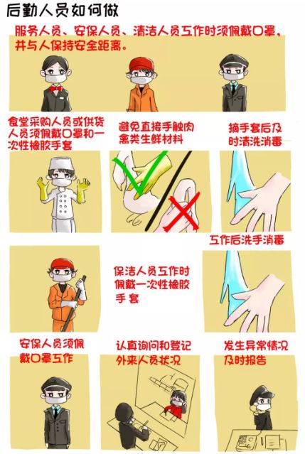 服務(wù)人員、安保人員、清潔人員工作時(shí)須佩戴口罩,并與人保持安全距離。食堂采購(gòu)人員或供貨人員須佩戴口罩和一次性橡膠手套,避免直接手觸肉禽類生鮮材料,摘手套后及時(shí)洗手消毒。保潔人員工作時(shí)須佩戴一次性橡膠手套,工作結(jié)束后洗手消毒。安保人員須佩戴口罩工作,并認(rèn)真詢問(wèn)和登記外來(lái)人員狀況,發(fā)現(xiàn)異常情況及時(shí)報(bào)告。