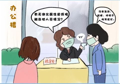 須佩戴口罩。進(jìn)入辦公樓前首先進(jìn)行體溫檢測(cè),并介紹有無(wú)湖北居住史或接觸當(dāng)?shù)厝藛T情況,以及有無(wú)發(fā)熱、咳嗽、呼吸不暢等癥狀。無(wú)上述情況,且體溫在37.2°正常條件下,方可入樓公干。