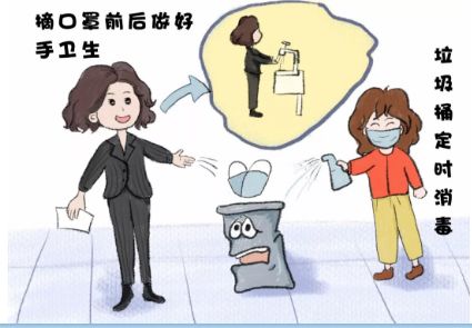 防疫期間,摘口罩前后做好手衛(wèi)生,廢棄口罩放入垃圾桶內(nèi),每天兩次使用75%酒精或含氯消毒劑對(duì)垃圾桶進(jìn)行消毒處理。