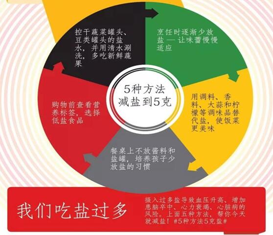 2012年中國居民營養(yǎng)與健康狀況監(jiān)測結(jié)果顯示,我國人均烹調(diào)鹽日攝入量高達(dá)10.5克。而中國居民膳食寶塔2016版提出鹽攝入量為每日<6克。發(fā)現(xiàn)長期的高鹽飲食會使粒細(xì)胞抵抗細(xì)菌的能力降低,人體的免疫功能被削弱。