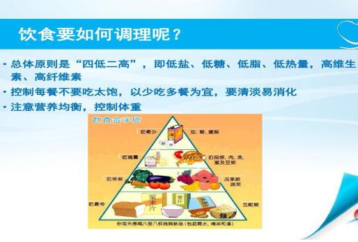 2.合理飲食:以低鹽低脂、清淡易消化飲食為主,飲食規(guī)律,每餐進食七分飽,避免暴飲暴食,多吃富含粗纖維的蔬菜水果,如芹菜、菠菜、胡蘿卜、香蕉、蘋果、獼猴桃等,保持大便通暢、勿屏氣用力排便,以免誘發(fā)心肌缺血現(xiàn)象;合并高血糖、糖尿病患者應嚴格控制水果攝入量,多食優(yōu)質(zhì)蛋白:蝦、魚類、雞肉、瘦豬肉、豆制品。每日食用油量25g,用鹽量不超過6g,約1啤酒瓶蓋??谖镀逃泻芏啾锥耍缮哐獕?、引起動脈粥樣硬化,限制鈉鹽攝入量。每天飲水2000ml左右可以保證機體基礎(chǔ)水分需求。