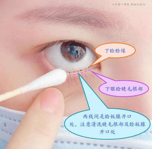 用嬰兒沐浴露或含有次氯酸、茶樹(shù)油等成分的眼部濕巾常規(guī)清潔瞼緣。