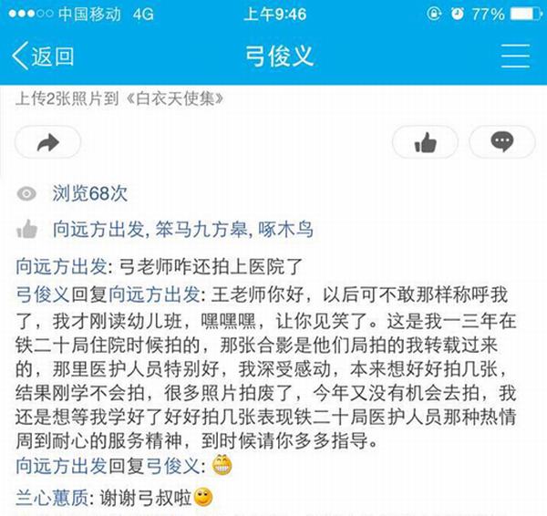“你們還記得前年在咱科住過的一個叫弓俊義的患者嗎?這些照片都是他拍的!”我忽地就想起來那位個子不高,身材瘦小,臉上掛滿笑容的大叔。記得他住院時和他交談的過程中提過他愛好攝影,只是這些照片是他什么時候拍的?又是怎么到護(hù)士長手機上的呢?