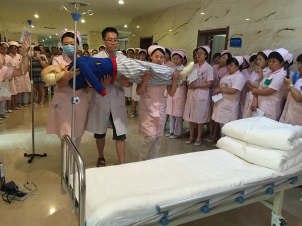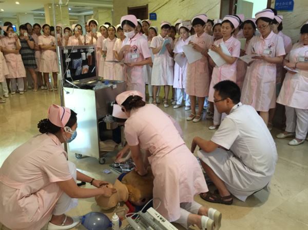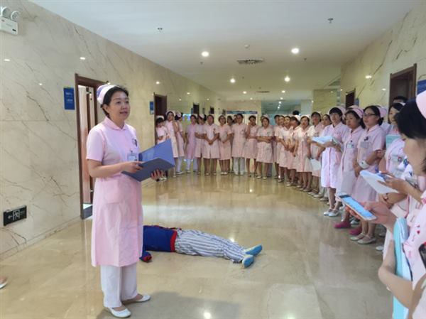 此次演練是為檢驗我院護理管理體系的應急指揮協(xié)調(diào)能力、護理人員急危重癥護理綜合能力、急救儀器設備性能狀態(tài)。演練過程按既定方案進行,模擬心臟急診/胸痛中心在短時間內(nèi)接診2名急危重癥患者,造成護理人員緊缺,急需調(diào)配人員支援。 一陣緊促的電話鈴聲響起,急診科的護士送一位急性左心功能衰竭患者至搶救室,在醫(yī)生護士的緊密合作下,深大急促的呼吸漸趨平穩(wěn)、慌亂的心跳逐漸恢復中。突然出現(xiàn)一陣恐慌聲“醫(yī)生、護士,有人昏倒在走廊”,在心臟急診/胸痛中心人員緊張情況下,李靜護士長即刻組織科室人員對走廊昏迷患者進行搶救,并立即打電話通知護理部調(diào)派人員參與搶救。3分鐘后,增派人員達到,共同對患者進行搶救。經(jīng)過積極的搶救,患者復蘇成功,繼續(xù)給予高級生命支持,并通知家屬。所有護士長、護理骨干、輪轉護士等八十余人,在現(xiàn)場觀摩了“事件報告、啟動方案、現(xiàn)場搶救、患者疏散、三人搬運法、復蘇后的后續(xù)工作”等重要環(huán)節(jié),清晰、全面了解了突發(fā)事件發(fā)生時護理人力資源調(diào)配流程。
