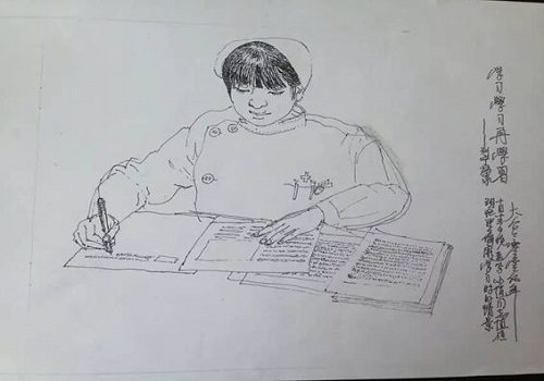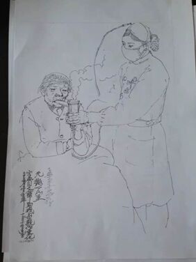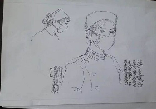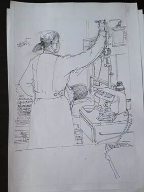 21床患者是位89歲的老太太,患有慢性阻塞性肺疾病,在科室住院已經(jīng)18天,在我們醫(yī)護人員的精心治療與照護下慢慢好轉(zhuǎn),這天終于可以出院回家了。辦理出院手續(xù)的當天上午,患者的兒子來到護士工作站,遞給辦公護士幾張勾畫過的白紙,待看清楚紙上的內(nèi)容后,她愣住了——原來那竟是幾幅精心描繪的人物畫像。畫的是誰?是給患者做輸液治療的護士、是給患者更換液體的護士、是幫助老人做霧化的護士、是在認真書寫護理記錄單的護士……簡潔又流暢的線條、樸素而生動的白描勾勒出護士們?nèi)粘Cβ档纳碛?,樸實又詳細的畫旁注解記錄了護士們平日點滴的工作。這是患者兒子在陪護的間隙用心記錄下來的,特意在患者出院時送給護士們留作紀念、表示感謝。