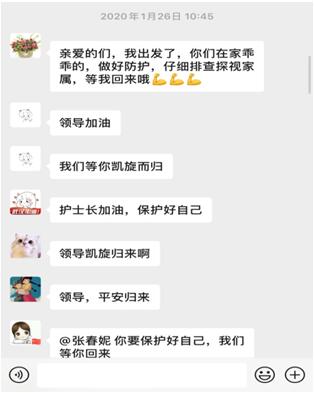 面對(duì)日漸增多的病例,身為醫(yī)務(wù)人員的我們自然責(zé)無旁貸。1月23日,科室接到醫(yī)院號(hào)召護(hù)理人員援鄂抗擊疫情的通知,所有兄弟姐妹們紛紛踴躍報(bào)名,得到的都是護(hù)士長諸如“你很棒,等待通知”“好,第二梯隊(duì)準(zhǔn)備”之類的回復(fù),那時(shí)候我們懵懂,心底十足的使命感使我們熱血沸騰。之后的三天風(fēng)平浪靜,沒有接到任何通知,似乎一切都沒有發(fā)生過。直到1月26日,護(hù)士長在群里的一段話讓我們炸開了鍋:“親愛的們,我出發(fā)了,你們?cè)诩夜怨缘?,做好防護(hù),仔細(xì)排查探視家屬,等我回來”。這時(shí)我們才知道,為什么報(bào)名后遲遲沒有動(dòng)靜,在這國家危難時(shí)候,護(hù)士長她心里只揣著一名護(hù)士的職責(zé),她“拋下”了為人子女、為人妻、為人母的責(zé)任,把我們擋在后方,而把自己推到了最前線,把直面疫情的重任和未知的危險(xiǎn)統(tǒng)統(tǒng)擔(dān)在了自己的肩上。
