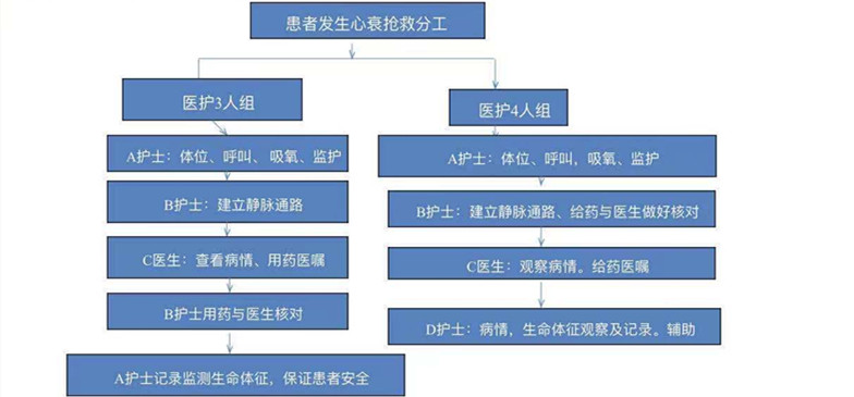 心血管內科三病區(qū)護理團隊針對患者發(fā)生急性左心衰,提出了心衰搶救有效分工及心衰早期識別及預防的護理難點,通過文獻的查閱、指南的查閱,難點被一點點的解答。王娟護士將查找心衰最新指南中取消酒精濕化吸氧、四肢輪扎的原理做了詳細節(jié)解讀;陳娜護士提出了人文關懷對于急性心衰患者搶救時的重要性;通過討論科室制定了搶救分工流程圖,形成了最終的標準化流程,分為夜間3人組及日間4人組。分工明確、有條不紊,為心衰患者的搶救贏得寶貴時間。各科護士長及護理骨干針對心衰患者的護理、識別及工作中的經(jīng)驗展開了激烈討論與經(jīng)驗分享。提出了預見性護理的重要性,并舉例說明因為預見性護理而及時拯救患者生命的工作經(jīng)歷,提升了我們在護理危重患者時的預警能力。