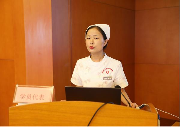 本期培訓(xùn)班優(yōu)秀學(xué)員代表李露發(fā)言:她代表全體學(xué)員對院領(lǐng)導(dǎo)給予心血管??谱o(hù)士培訓(xùn)班的大力支持表示感謝。她講到2個月的培訓(xùn)使我們的理論知識在這里得到了補(bǔ)充,最前沿的診療新技術(shù)在這里得到了詮釋,規(guī)范化操作流程和技術(shù)在這里得到了正確指導(dǎo)和掌握,并且和同事們結(jié)下了深厚的友誼。引領(lǐng)心血管專業(yè)高、精、尖技術(shù)的發(fā)展,我們會牢記使命,不忘初心,星星之火,拓荒燎原,在以后的工作中我們將以精湛的??谱o(hù)理技術(shù)服務(wù)于患者,為心血管病院的發(fā)展貢獻(xiàn)我們的一份力量。