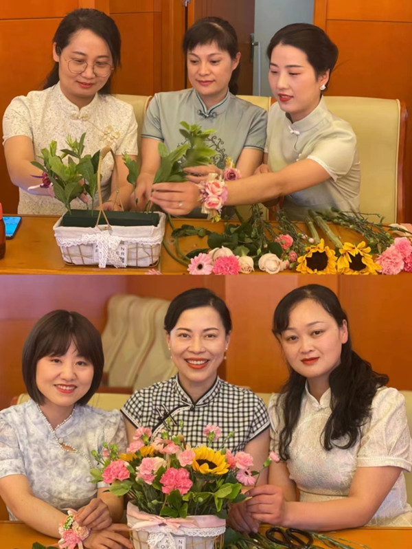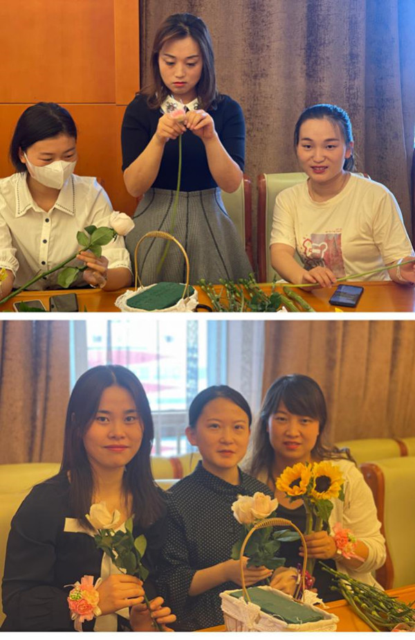 嬌艷的玫瑰、如火的康乃馨、淡雅恬靜的勿忘我、潔白的百合頗有藝術(shù)地插在花籃里,有的千姿百態(tài)、有的古典高雅、有的雍容華貴、有的溫文爾雅、有的小家碧玉…一個個漂亮的小花籃就這樣誕生了!作品完成后花藝老師對每組的作品進行逐一點評并評選出優(yōu)秀作品。“插花師”們把最美好的祝福,送給在場備受尊重的老師們,寓意“美麗花籃送祝福,愿美好生活與您永相伴”