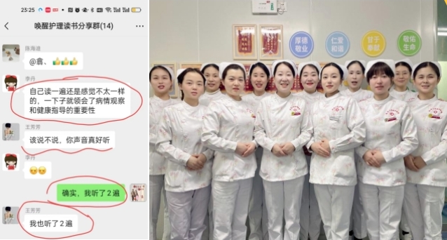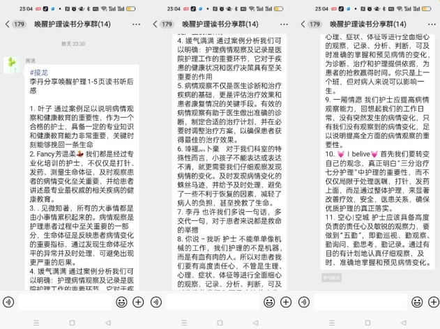 第一天讀書分享后,我主動帶頭將聽書后感想發(fā)至群內(nèi),護士姐妹們熱情高漲,讀書聽書積極性很高,分別接龍分享了自己聽書后的感想,丹丹護士表達“自己讀一遍還是感覺不太一樣的,一下子就領會了病情觀察和健康指導的重要性”。芳芳護士分享“我們都是經(jīng)過專業(yè)化培訓的護士,不僅僅是打針、發(fā)藥、測量生命體征,及時觀察患者的病情變化至關重要,并給患者講述最專業(yè)最權威的相關疾病的健康教育......”大家分別分享著自己的心得體會,沉浸在讀書的氛圍中……