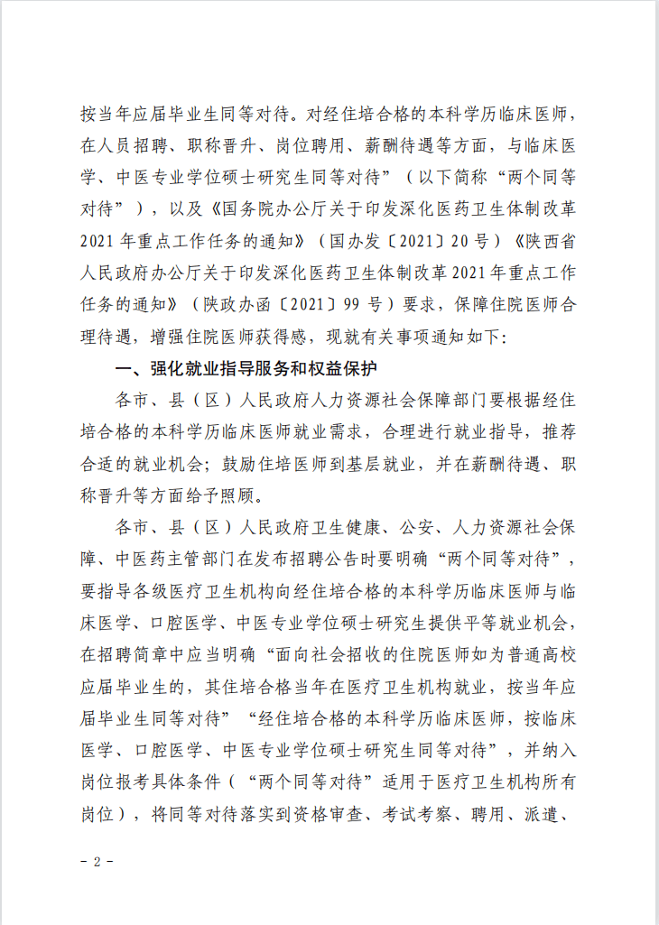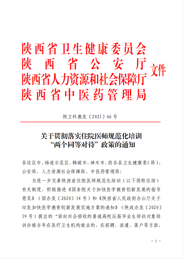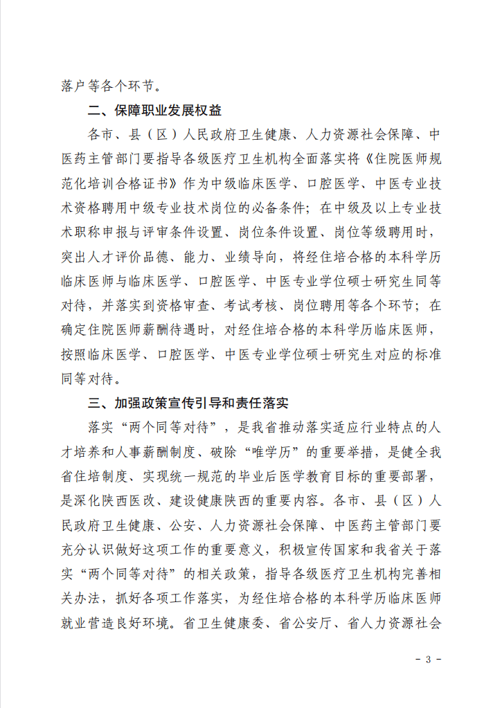 落實(shí)“兩個同等對待”,是我省推動落實(shí)適應(yīng)行業(yè)特點(diǎn)的人才培養(yǎng)和人事薪酬制度、破除“唯學(xué)歷”的重要舉措,是健全我省住培制度、實(shí)現(xiàn)統(tǒng)一規(guī)范的畢業(yè)后醫(yī)學(xué)教育目標(biāo)的重要部署,是深化陜西醫(yī)改、建設(shè)健康陜西的重要內(nèi)容。各市、縣(區(qū))人民政府衛(wèi)生健康、公安、人力資源社會保障、中醫(yī)藥主管部門要充分認(rèn)識做好這項(xiàng)工作的重要意義,積極宣傳國家和我省關(guān)于落實(shí)“兩個同等對待”的相關(guān)政策,指導(dǎo)各級醫(yī)療衛(wèi)生機(jī)構(gòu)完善相關(guān)辦法,抓好各項(xiàng)工作落實(shí),為經(jīng)住培合格的本科學(xué)歷臨床醫(yī)師就業(yè)營造良好環(huán)境。