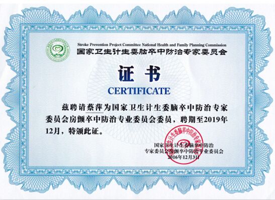 我院蔡萍同志獲聘為國家衛(wèi)生計生委腦卒中防治專家委員會房顫卒中防治專業(yè)委員會委員