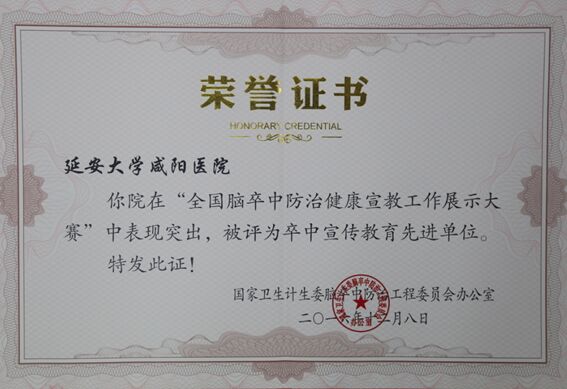 2016年12月8日,由國家衛(wèi)生計生委腦卒中防治工程委員會主辦的“2016年腦卒中防治工程工作總結(jié)暨國家卒中中心建設(shè)工作會議”在福建省福州市成功召開。全國人大常委、國家衛(wèi)計委腦防委副主任王隴德院士、國家衛(wèi)計委醫(yī)政醫(yī)管局郭燕紅副局長、陜西省衛(wèi)生計生委孫振霖副主任等領(lǐng)導(dǎo)和全國31個省區(qū)市衛(wèi)生計生委醫(yī)政醫(yī)管負責(zé)人出席了此次會議,我院姚曉峰副院長受邀參加了本次盛會。在大會的年度工作評選中,我院在“全國腦卒中防治健康宣教工作展示大賽”被評選為“卒中宣傳教育先進單位”,以表彰我院在卒中宣傳教育工作展示大賽中的突出表現(xiàn)。