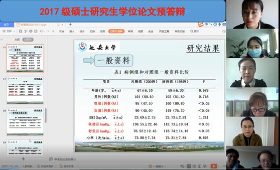 2020年3月3日,延安大學(xué)咸陽醫(yī)院2017級碩士學(xué)位論文線上預(yù)答辯順利舉行。我院牛小麟名譽(yù)院長、科研教學(xué)管理中心韓曉芳主任、王丙聚副院長、趙雄飛副院長、陳萍博士、廉秋芳博士、左梅教授、郭愛紅教授參加此次線上預(yù)答辯。預(yù)答辯由韓曉芳主任主持,2017級碩士研究生進(jìn)行了線上預(yù)答辯。