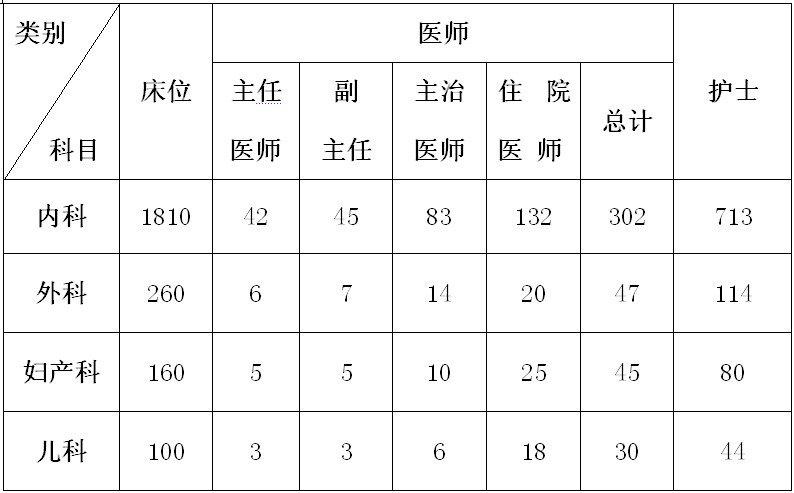 (7)內(nèi)分泌內(nèi)科:設(shè)置床位40張,內(nèi)含搶救室、ICU室,設(shè)立骨髓檢查室、內(nèi)分泌實(shí)驗(yàn)室,并配置相應(yīng)的設(shè)施和設(shè)備。配備醫(yī)師7名(主任醫(yī)師1名、副主任醫(yī)師1名、主治醫(yī)師2名、醫(yī)師3名),護(hù)士16名。