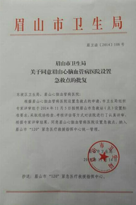 眉山市衛(wèi)生局批準(zhǔn)眉山心腦血管病醫(yī)院設(shè)置急救站點(diǎn)