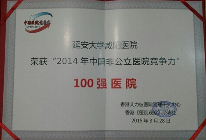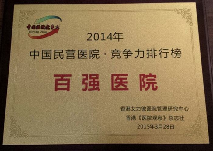 2015年3月28日,香港艾力彼醫(yī)院管理研究中心、醫(yī)院管理學(xué)院、香港《醫(yī)院觀察》雜志社聯(lián)合在廣州市舉辦“2014年中國(guó)非公立醫(yī)院競(jìng)爭(zhēng)力評(píng)比”,據(jù)悉參加評(píng)比的非公立醫(yī)院多達(dá)近千家,我院在評(píng)比中脫穎而出,最終榮獲“百?gòu)?qiáng)醫(yī)院”榮譽(yù)稱號(hào)。在此之前我院在2012年、2013年均入圍百?gòu)?qiáng)榜,且綜合競(jìng)爭(zhēng)力保持前列。