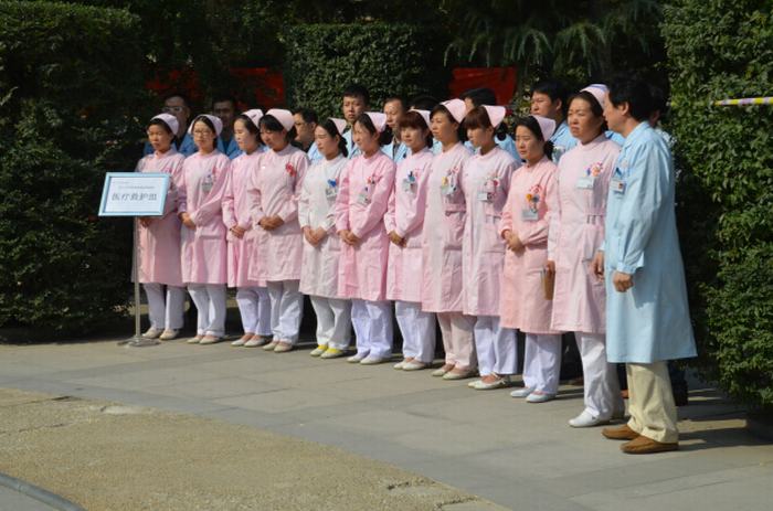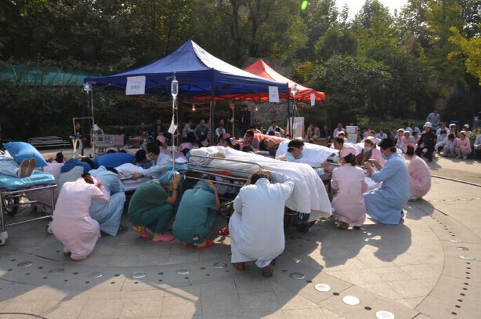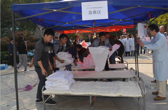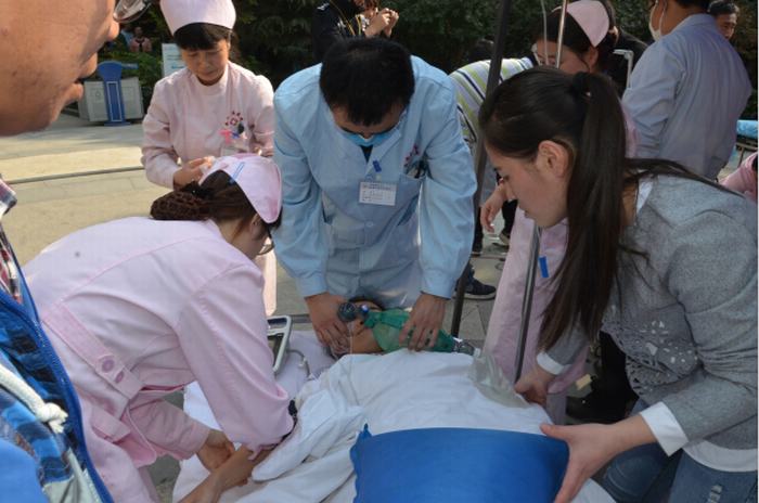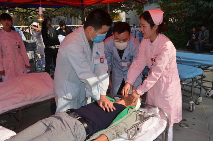 14點(diǎn)40分,外科樓各科室全部安全撤離至外科樓花園、延年苑、噴泉廣場(chǎng)等避震區(qū)域,各科室護(hù)士長(zhǎng)迅速清點(diǎn)科室人數(shù),并報(bào)告通訊聯(lián)絡(luò)組,通訊聯(lián)絡(luò)組匯總整體傷亡和損失情況后向總指揮作了簡(jiǎn)要匯報(bào)。總指揮立即決斷,命令搶險(xiǎn)疏散組、通訊聯(lián)絡(luò)組在外科樓外圍向樓內(nèi)喊話,尋找其他被困人員;指示后勤保障組緊急建立醫(yī)療區(qū)域,搭建了兩頂臨時(shí)帳篷作為指揮所和搶救室,架設(shè)220V供電線路提供照明,劃設(shè)急救區(qū)、治療區(qū)和警戒區(qū);指導(dǎo)醫(yī)療救護(hù)組救治震中受傷人員,救治中進(jìn)行了顱腦損傷、右脛骨骨折等病情的緊急救治,救治中使用了心肺復(fù)蘇、包扎、外固定、輸液、測(cè)量血壓、氧氣包吸氧等技術(shù)操作。