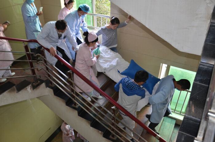 14點(diǎn)35分預(yù)警過(guò)后,晃動(dòng)停止。總指揮判斷現(xiàn)場(chǎng)情況,在樓房沒(méi)有明顯破壞的情況下,發(fā)出緊急疏散命令,隨后,總指揮和導(dǎo)演組撤離至醫(yī)技樓北面噴泉廣場(chǎng),成立臨時(shí)總指揮部??剖抑魅?、護(hù)士長(zhǎng)立即指導(dǎo)科室人員立即打開(kāi)所有通道,組織人員緊急處理各種病情的危重癥患者,將患者在擔(dān)架上固定好,并按疏散演練預(yù)定路線有序撤離到樓外花園臨時(shí)集合地。在疏散中各科室人員臨危不亂,始終以患者的安危為先。通訊聯(lián)絡(luò)組安排人員在各樓層樓梯間指導(dǎo)人員有序撤離,并監(jiān)察各科室演練實(shí)施情況。急診醫(yī)學(xué)科護(hù)士長(zhǎng)不顧自己的安危保護(hù)在地震中正在搶救的病人,核醫(yī)學(xué)科醫(yī)生冒著被輻射的生命危險(xiǎn)將一名正在檢查的行動(dòng)不便患者攙扶到安全區(qū)域,神經(jīng)內(nèi)科三病區(qū)、重癥醫(yī)學(xué)科等其他科室也妥善處理演練中安排的特殊患者。