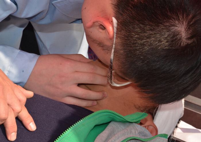 14點(diǎn)45分,通訊聯(lián)絡(luò)組向總指揮匯報(bào)在急診醫(yī)學(xué)科醫(yī)生辦公室出現(xiàn)局部坍塌,造成2人受傷被困;醫(yī)技樓二樓樓梯間堵塞,病理科人員無(wú)法撤離,需要排險(xiǎn)??傊笓]當(dāng)即指示搶險(xiǎn)疏散組攜帶鏟式擔(dān)架、氧氣包、撬棍、鐵鍬、應(yīng)急照明燈沖進(jìn)樓內(nèi)搶救被困傷員,經(jīng)過(guò)15分鐘的緊張營(yíng)救,2名被困的急診醫(yī)學(xué)科的醫(yī)務(wù)人員脫離危險(xiǎn)區(qū)域。地震時(shí)2名人員受傷,系顱腦損傷、右脛骨開(kāi)放骨折,顱腦損傷傷員到達(dá)噴泉廣場(chǎng)后出現(xiàn)呼吸心臟驟停,醫(yī)療救護(hù)組組長(zhǎng)沈建華副院長(zhǎng)立即指導(dǎo)醫(yī)務(wù)人對(duì)傷員進(jìn)行緊急救治,救治中使用了心肺復(fù)蘇、包扎、外固定、輸液、測(cè)量血壓、氧氣包吸氧等技術(shù)操作。之后地震演練繼續(xù)有序進(jìn)行。
