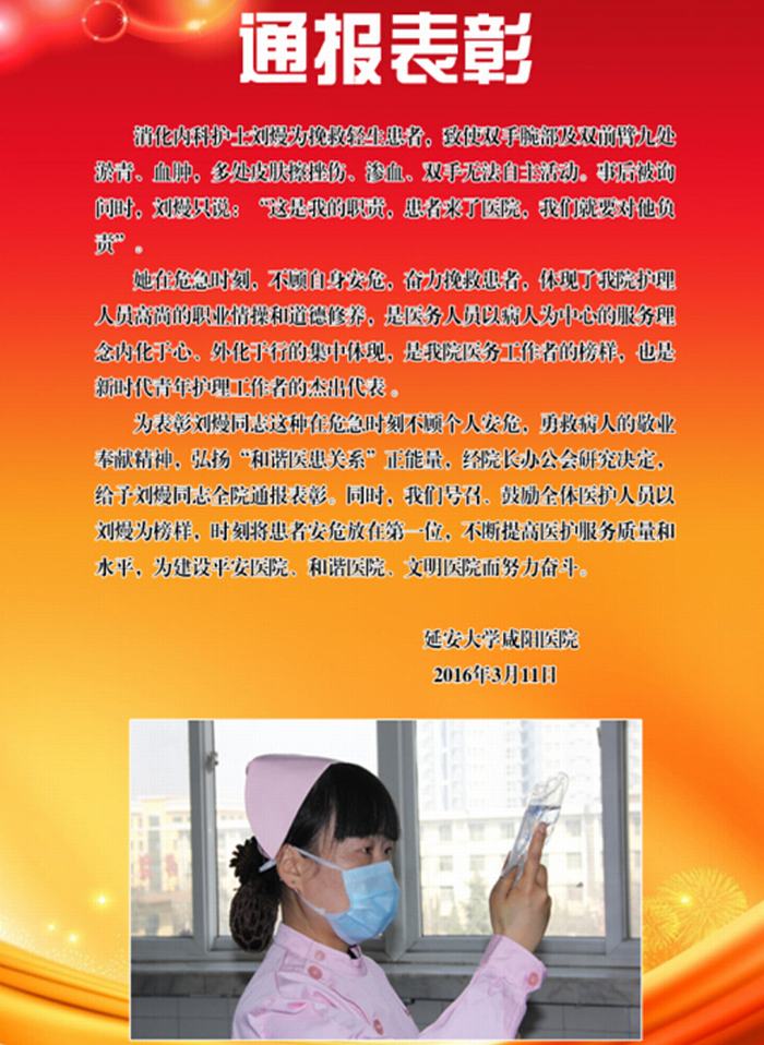 事情發(fā)生后,院領(lǐng)導(dǎo)高度重視,多次前往劉熳住處看望,并囑托她安心養(yǎng)傷。為表彰劉熳同志這種在危急時(shí)刻不顧個(gè)人安危,勇救病人的敬業(yè)奉獻(xiàn)精神,弘揚(yáng)“和諧醫(yī)患關(guān)系”正能量,經(jīng)院長(zhǎng)辦公會(huì)研究決定,給予劉熳同志”優(yōu)秀護(hù)士”稱號(hào)并全院通報(bào)表彰。同時(shí),我們號(hào)召、鼓勵(lì)全體醫(yī)護(hù)人員以劉熳為榜樣,時(shí)刻將患者安危放在第一位,不斷提高醫(yī)護(hù)服務(wù)質(zhì)量和水平,為建設(shè)平安醫(yī)院、和諧醫(yī)院、文明醫(yī)院而努力奮斗。