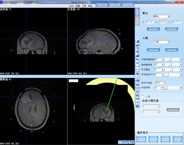 患者王某某,男,53歲,因“間斷頭痛半月”入神經(jīng)內(nèi)科十二病區(qū),發(fā)現(xiàn)顱內(nèi)占位后轉(zhuǎn)入神經(jīng)外科。既往患者有肺Ca病史,于一年前行手術(shù)治療。頭顱影像學(xué)診斷膠質(zhì)瘤?轉(zhuǎn)移瘤待排。2016年6月29日在3.0T磁共振定位后,劉增強副主任與其團隊為患者實施了立體定向腦內(nèi)病變活檢術(shù),此患者病灶為囊實性,手術(shù)難度較大,而一旦囊液流失則會發(fā)生腦組織漂移,導(dǎo)致靶點移位,因此手術(shù)計劃制定尤為重要,入顱點為右額部,穿刺后首先達到腫瘤實性部分,獲取病灶標本后,抽出部分囊液以緩解患者高顱壓癥狀,經(jīng)過精細的手術(shù)操作,最終成功獲取腫瘤標本,并且抽出約20ml腫瘤液,患者情況穩(wěn)定,術(shù)后兩小時即下床活動。