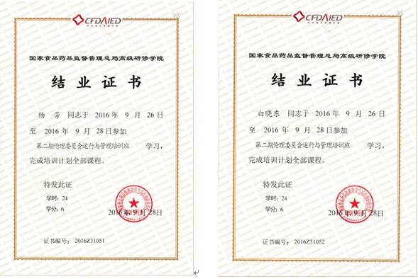 2016年9月26日-9月28日,由國(guó)家食品藥品監(jiān)督管理總局高級(jí)研修學(xué)院組織舉辦的“第二屆倫理委員會(huì)運(yùn)行與管理培訓(xùn)班”在古都西安隆重召開。我院醫(yī)學(xué)倫理委員會(huì)委員、制劑室楊芳同志、科教部干事白曉東同志應(yīng)邀參加了此次培訓(xùn)班,并按培訓(xùn)計(jì)劃順利完成全部課程的學(xué)習(xí),最終通過考核取得結(jié)業(yè)證書。