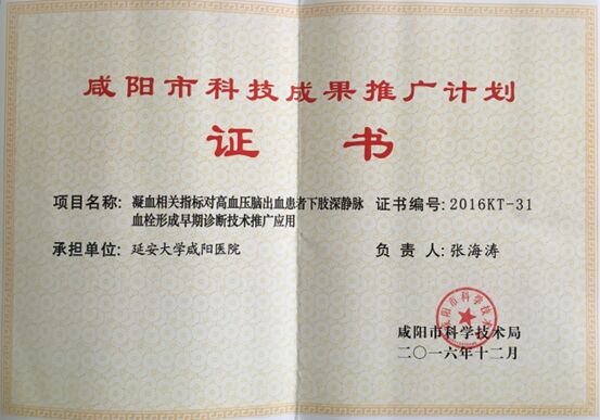 近日,據(jù)咸陽市科技局《關于下達“咸陽市二0一六年度科技成果推廣計劃”的通知》(咸政科【2016】184號)的文件,我院張海濤副院長領銜申報的科研項目“凝血相關指標對高血壓腦出血患者下肢深靜脈血栓形成早期診斷技術推廣應用”成功獲批為“咸陽市2016年度科技成果推廣計劃”項目!