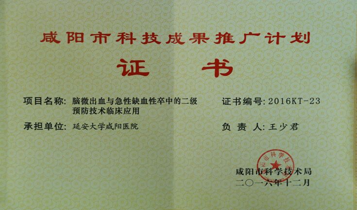 近日,據(jù)咸陽(yáng)市科學(xué)技術(shù)局《關(guān)于下達(dá)“咸陽(yáng)市二〇一六年度科技成果推廣計(jì)劃”的通知》(咸政科【2016】184號(hào))的文件,我院王少君副主任領(lǐng)銜申報(bào)的科研項(xiàng)目“腦微出血與急性缺血性卒中的二級(jí)預(yù)防技術(shù)臨床應(yīng)用”成功獲批為“咸陽(yáng)市二〇一六年科技成果推廣計(jì)劃”項(xiàng)目!