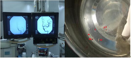 為了讓患者得到更有效、更安全的治療,在與患者家屬溝通后決定急診行全腦血管造影術+機械取栓術??滩蝗菥徎颊弑坏谝粫r間送入導管室,迅速完成了DSA血管造影,證實左側(cè)大腦中動脈M1段起始閉塞, 在神經(jīng)外科知名教授專家姚曉峰副院長帶領下,王偉偉副主任和宋波主治醫(yī)師協(xié)助下成功完成手術,取出栓子,復查造影顯示閉塞大腦中動脈完全開通,患者意識及右側(cè)肢體活動明顯好轉(zhuǎn),此時,距患者發(fā)病不到5個小時。