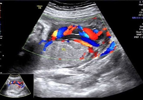 聲像圖示:臍帶帆狀插入胎盤(pán)并血管前置