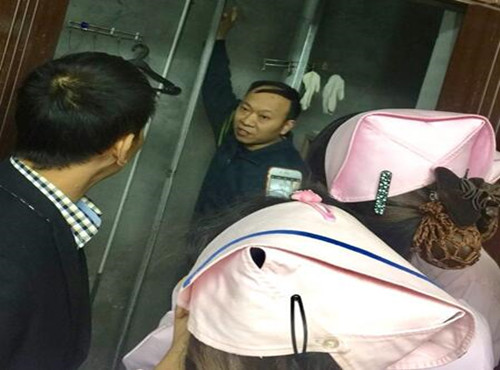 安裝氧氣的工程師側(cè)身站在管道井中 告知大家如何辨別氧氣管和負(fù)壓管