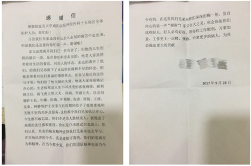 當我們看到這封感謝信的時候,我們感到挺意外的,患者已經(jīng)去世三個多月了,患者家屬為了感謝我們醫(yī)護人員,在老人生命中最后的時間里所做出的醫(yī)療護理服務活動。我們對患者記憶深刻,他是我們科的老病人,八十多歲的老人,由于年齡和身體上的疾患,雖然骨瘦嶙峋,但是老人每次來住院都是不斷的為我們豎起大拇指。好幾年來住院每次都是選擇我們科室,這是對我們郝鋒利副主任和全科醫(yī)護人員的信任。