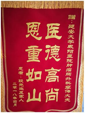 在腫瘤胸外科醫(yī)護(hù)人員的悉心照顧和精心治療下,患者已康復(fù)出院,為表達(dá)救命之恩,患者及家屬特贈(zèng)送一面書寫著“恩重如山,醫(yī)德高尚”的錦旗。