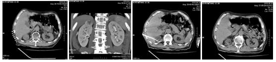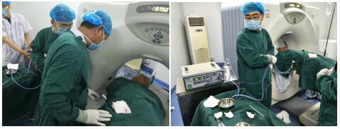 化療后病人一般情況尚可,經(jīng)過充分的術(shù)前檢查及準(zhǔn)備后,2018年6月26日在苗滿園主任的帶領(lǐng)下,與CT室聯(lián)合進(jìn)行手術(shù),局麻后在CT引導(dǎo)下將電極針準(zhǔn)確插入腫瘤內(nèi)部,對腫瘤實施微波消融術(shù)。僅20分鐘順利完成手術(shù),達(dá)到了預(yù)期的滿意效果和消融范圍。術(shù)中患者清醒無不適,術(shù)后6個小時患者即可下床活動。術(shù)后評估微波消融治療范圍,無出血及鄰近臟器損傷。