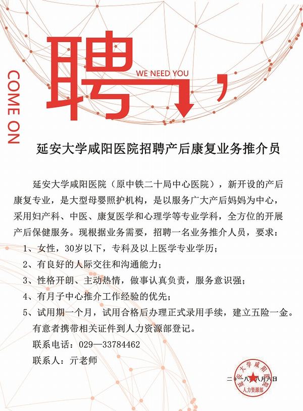 延安大學(xué)咸陽醫(yī)院招聘產(chǎn)后康復(fù)業(yè)務(wù)推介員