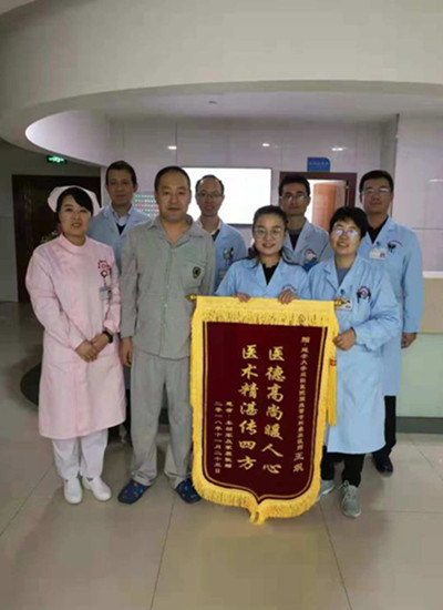 2018年11月14日05:20,夜班護(hù)士像往常一樣緊張有序的忙碌著,急診科送來(lái)一名男性患者,37歲,家住黑龍江,坐飛機(jī)途中發(fā)病,以“頭暈伴惡心嘔吐、全身乏困10小時(shí)”主訴入院,急查顱腦CT示:未見(jiàn)異常。于11月15日行頭顱MRI,危機(jī)值提示:右側(cè)小腦大面積腦梗死,病情急,科室主任來(lái)海歐及王颯主治醫(yī)生為患者制定了詳細(xì)的治療方案,王寶艷護(hù)士長(zhǎng)及時(shí)妥善安置患者家屬。經(jīng)過(guò)家屬及醫(yī)護(hù)人員的精心治療與護(hù)理,患者病情好轉(zhuǎn),在出院時(shí)贈(zèng)送醫(yī)務(wù)人員一面錦旗。