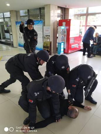 按照方案,保衛(wèi)科事先假扮二名持刀歹徒,攜帶長刀,走到急診科的診室內(nèi),以看病醫(yī)生態(tài)度不好為由鬧事,打傷醫(yī)生后挾持醫(yī)生準備逃離,急診科的護士見狀后立即撥打保衛(wèi)科電話報警,收費室見狀按下報警器。接到報警后保衛(wèi)科與警務(wù)工作站聯(lián)動,警務(wù)工作站蔡教導和陳警官立即趕到現(xiàn)場,隨后保衛(wèi)科科長和隊員攜帶防暴器材也趕到現(xiàn)場。陳警官與歹徒協(xié)商期間,保衛(wèi)科長趁歹徒不注意,沖上前去,與歹徒搏斗。其他隊員立即響應(yīng),合力控制二名歹徒。然后將歹徒帶至警務(wù)工作站處理,至此,演練結(jié)束。