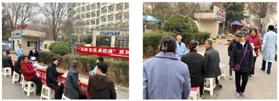 當(dāng)日上午9點(diǎn),耳鼻咽喉科在本院大門口,車輛往來如織的文林路旁,流動(dòng)人口密集處,設(shè)立桌椅,拉起“愛耳,音亮,鼻腔通系列活動(dòng)”及印有本次活動(dòng)主題的橫幅,向來往行人,進(jìn)行免費(fèi)義診公益活動(dòng)。我院耳鼻咽喉科主任張立剛親自坐陣,帶領(lǐng)科室醫(yī)務(wù)人員為市民進(jìn)行免費(fèi)檢查咨詢及發(fā)放宣傳資料等。