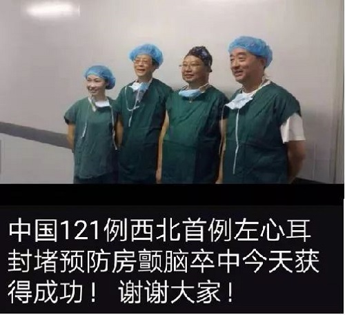 2014年11月6日,張玉順及宋志遠(yuǎn)教授在延安大學(xué)咸陽(yáng)醫(yī)院為備受心房顫動(dòng)折磨的何先生完成了西北首例左心耳封堵術(shù),揭開了我院心腦同治的新紀(jì)元。