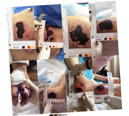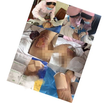 惆悵、無奈、擔憂于眼前都是多余,眼下我們要做的是如何著手護理此患者。按要求我們填寫了相關記錄表,立即請壓瘡專業(yè)組劉娜護士長進行會診。配合她一起對患者的所有瘡面進行了清洗,清除焦痂和腐肉、對無法立刻去除的焦痂創(chuàng)面開窗引流,根據不同創(chuàng)面分別進行處理,促進肉芽組織生長,保護暴露的肌腱和肌肉……,這樣的彎腰俯身護理一做就是2個多小時。