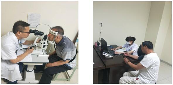 眼科醫(yī)生查看眼底 內(nèi)科醫(yī)生測量血壓