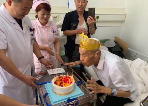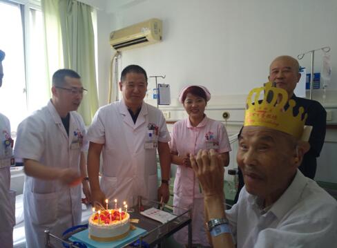 2019年8月22日上午,放療科的病房里其樂融融。“祝你生日快樂!祝你生日快樂……” 伴隨著歡快的歌聲,尹信主任帶領(lǐng)科室人員端著生日蛋糕來到趙大爺床前?!按鬆?,祝您生日快樂!壽比南山!早日健康!”。 老人愣了一下,繼而開心不已,笑的像個(gè)孩子:“來醫(yī)院看個(gè)病,還給過生日……嘿嘿……”