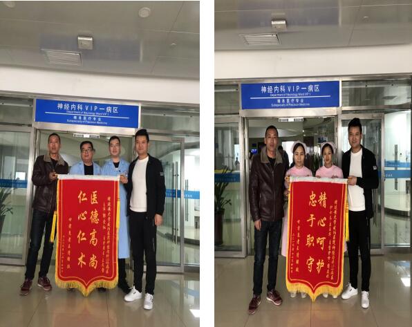 12月24日,忙忙碌碌的神經(jīng)內(nèi)科貴賓一病區(qū)上演了溫馨的一幕。一位剛剛出院的患者家屬向科室贈送了2面印有金燦燦大字的“醫(yī)德高尚,仁心仁術(shù)”“精心呵護(hù),忠于職守”的錦旗。