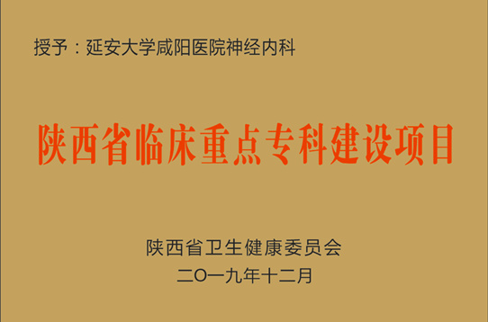 延安大學(xué)咸陽(yáng)醫(yī)院神經(jīng)內(nèi)科是咸陽(yáng)市重點(diǎn)學(xué)科、咸陽(yáng)市神經(jīng)內(nèi)科質(zhì)量控制中心依托單位、咸陽(yáng)市11個(gè)科技創(chuàng)新團(tuán)隊(duì)依托單位、咸陽(yáng)市轉(zhuǎn)化醫(yī)學(xué)工程技術(shù)研究中心依托單位、神經(jīng)內(nèi)科專業(yè)國(guó)家藥物臨床試驗(yàn)機(jī)構(gòu)等;2017國(guó)家衛(wèi)計(jì)委腦防委和陜西衛(wèi)計(jì)委聯(lián)合授予“國(guó)家高級(jí)卒中中心”,2018年中國(guó)卒中學(xué)會(huì)與中國(guó)卒中中心聯(lián)盟聯(lián)合授予“綜合卒中中心”,是咸陽(yáng)市“咸陽(yáng)卒中聯(lián)盟理事長(zhǎng)單位”,是“咸陽(yáng)市卒中學(xué)會(huì)會(huì)長(zhǎng)單位”,是咸陽(yáng)市醫(yī)學(xué)會(huì)神經(jīng)內(nèi)科專業(yè)委員會(huì)主任委員單位。