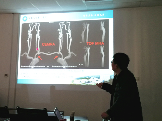 下午3點(diǎn),授課開始,仲海教授分別從CEMRA與TOFMRA在血管壁成像上的優(yōu)勢(shì)、血管斑塊成分分析及活動(dòng)度判定、血管壁重塑基本概念及HRMR臨床應(yīng)用和指導(dǎo)治療等方面入手,結(jié)合臨床及影像病例,展示隨訪科研數(shù)據(jù),生動(dòng)詳細(xì)的講解了CEMRA與TOFMRA在血管壁成像上的重要作用及豐富價(jià)值,讓我們學(xué)習(xí)到血管壁成像強(qiáng)化的重要性、對(duì)斑塊的精準(zhǔn)分類判定的方法及影像報(bào)告需要提供哪些有效信息,同時(shí)他還指出,CEMRA顯示血管狹窄情況能與DSA一致,對(duì)管腔信息、斑塊形態(tài)、活動(dòng)度鑒別等能夠?yàn)榕R床提供客觀數(shù)據(jù),為臨床預(yù)后,跟蹤與針對(duì)治療能提供極大幫助。課后,我科張媛、張濤責(zé)任總醫(yī)師、蔣小鋒、蔡雷等二線醫(yī)師,張飛、馬旭陽等一線醫(yī)師、呂琳、陳浩、白江濤等技師分別就各自問題向仲海教授提問交流,學(xué)習(xí)氣氛濃厚,與會(huì)人員收益匪淺!