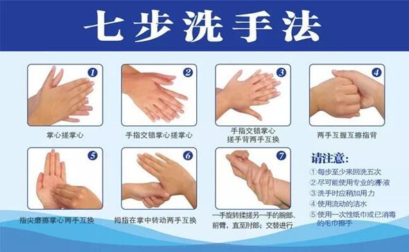 (4)勤洗手(七步洗手法),使用肥皂或洗手液流動水洗手,用一次性紙巾或干凈毛巾擦干雙手。雙手接觸呼吸道分泌物后(如打噴嚏后)應立即洗手。