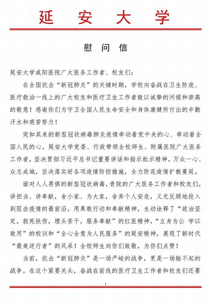 延安大學(xué)致延安大學(xué)咸陽(yáng)醫(yī)院廣大醫(yī)務(wù)工作者、校友慰問(wèn)信