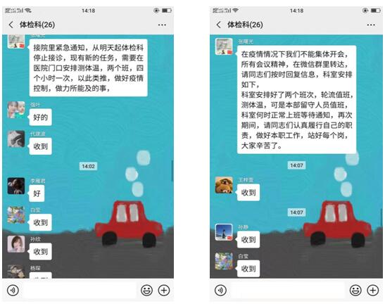 體檢科主任張曙光和護士長吳亞婭經(jīng)過協(xié)商立即召開科室微信群緊急會議,安排落實抽調(diào)科室人員支援院前發(fā)熱患者篩查工作,《通知》還未傳達完,大家已熱血沸騰,主動請纓,請戰(zhàn)到疫情防控的最前沿,紛紛表示“作為一名醫(yī)護工作者,我們隨時聽候組織調(diào)遣,為打贏新型冠狀肺炎疫情阻擊戰(zhàn),貢獻一份自己的力量”??浦魅魏妥o士長為大家的熱情而感動。為避免科室人員密集增加交叉感染的風(fēng)險,同時合理利用醫(yī)療資源,科主任與護士長慎重考慮后將科室人員進行了分工,一部分留守科室,完善之前體檢報告,接聽咨詢電話,做好前來體檢人員勸返、解釋工作,并做好攜體檢報告咨詢的客戶解讀工作。這一部分工作人員可謂是“以一當(dāng)十”,“萬千重?fù)?dān)于一身”,但是她們?nèi)钥朔鞣N困難,堅守崗位,肩負(fù)起了科室全部工作。另一部分支援醫(yī)院一線防護工作——院前發(fā)熱患者篩查,該部分人員將直接接觸發(fā)熱患者,可能存在被感染風(fēng)險。
