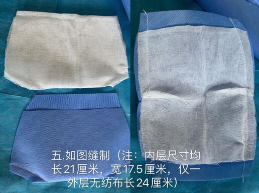 此事得到放療科尹信主任和院領(lǐng)導(dǎo)的大力支持,他經(jīng)過再次防水及透氣試驗,并親自佩戴體驗后,認為此法可行推廣。此口罩可多次紫外線重復(fù)消毒使用,也可居家蒸煮消毒15分鐘,晾干備用,切記不可揉搓,以節(jié)約有限的醫(yī)療資源。